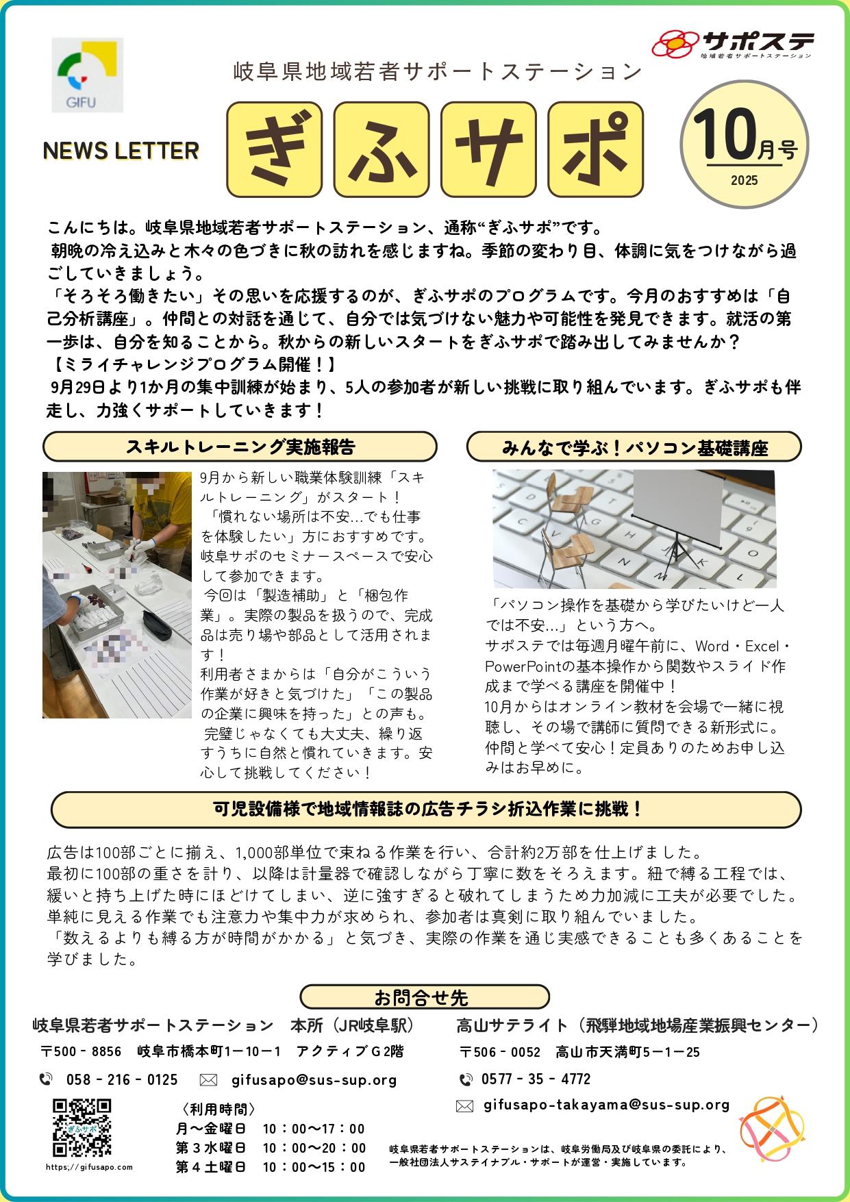 おはようございます☺️ぎふサポです🥰秋がゆっくりとした足取りでやってきていますね。金木犀の香りがだんだんと漂ってきたなと最近感じます。ぎふサポでは9/29から集中訓練が始まりました🤗10/6~10/10の間は合宿にて、プログラムや職業体験をし、夜には自炊!写真の日は餃子を作りました🤤 pic.twitter.com/Usu97rSLuo— ぎふサポ(岐阜県地域若者サポートステーション) (@GF_sapoST) October 14, 2025